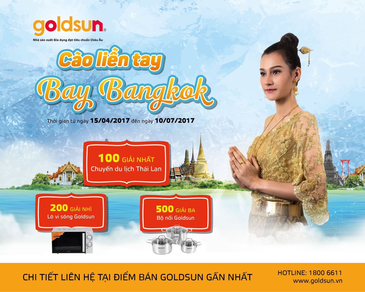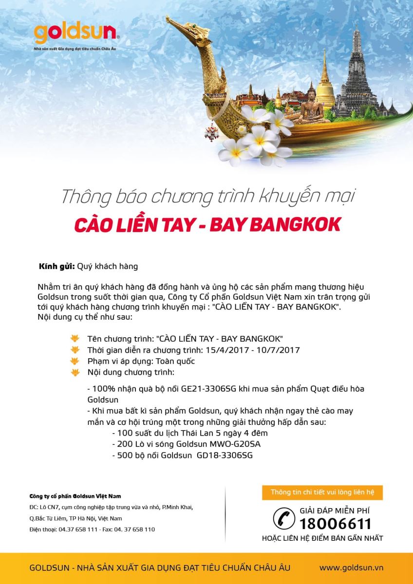 Từ ngày 15/04/2017 đến ngày 10/07/2017, khi mua bất kì một sản phẩm của GOLDSUN VIỆT NAM trên toàn quốc, Khách hàng sẽ nhận ngay một thẻ cào trúng thưởng với cơ cấu giải thưởng như sau :